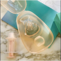 O conjunto inicial completo inclui o protetor de mamilo Flow, um estojo prático que também funciona como esterilizador a vapor para facilitar o transporte e uma seringa de limpeza para manter o canal interno do Flow higienizado.