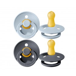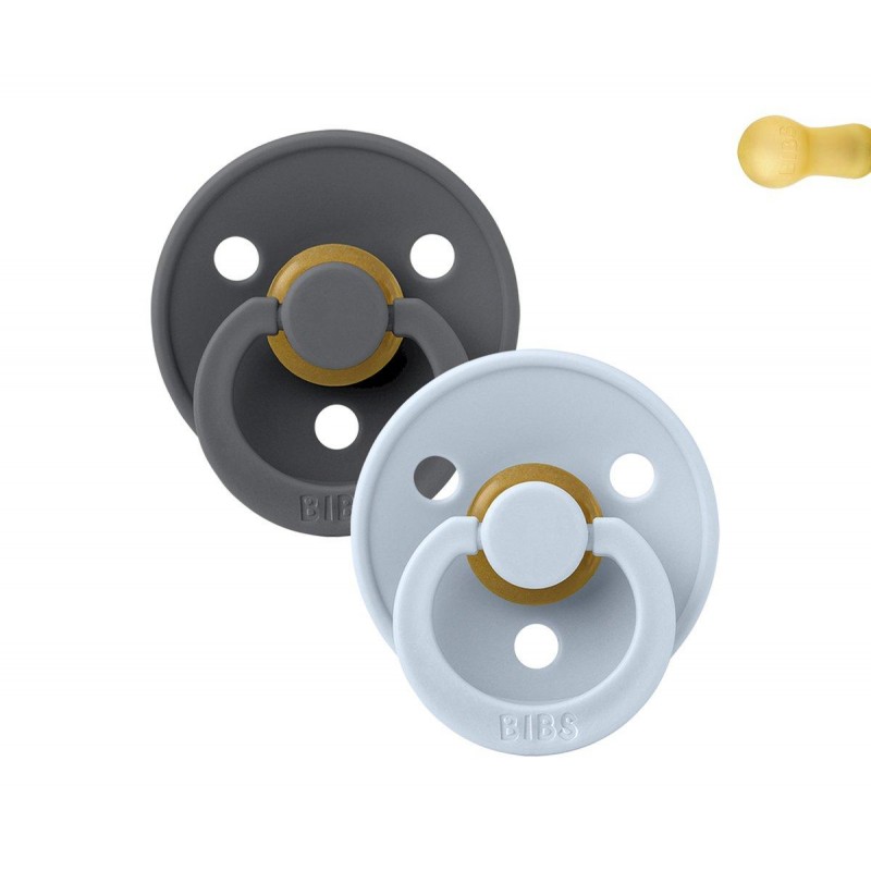A BIBS Colour é a chupeta original da BIBS e está no mercado há mais de 40 anos. Tem o escudo redondo de assinatura BIBS com três orifícios de ventilação e anel de alça redondo.