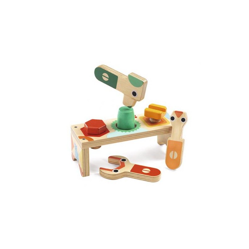 Possui um pequeno banco colorido com uma cavilha e parafusos, todos codificados por cores.