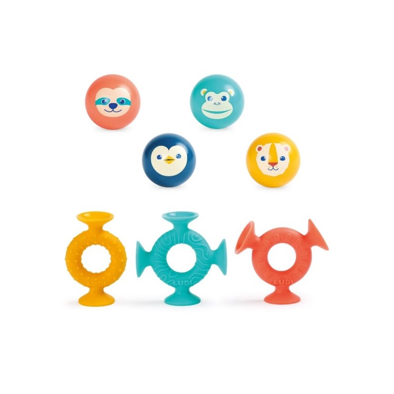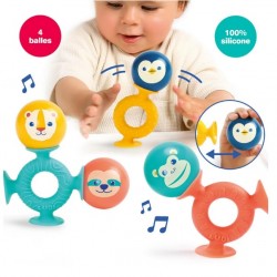 O bebé pode divertir-se a agitar as 4 bolas coloridas e barulhentas ou até mesmo usar as ventosas com as bolas como chocalho.
