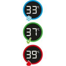 Indicador de cor permite-lhe saber se a temperatura é segura e confortável para o seu bebé: azul significa frio, vermelho significa quente e verde significa que está no ponto certo (35 - 38 °C)