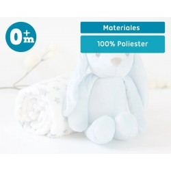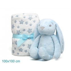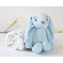 Este suave coelho de peluche azul, acompanhado de uma mantinha polar com estampado de estrelas, é o companheiro ideal para os primeiros meses do bebé.