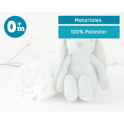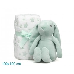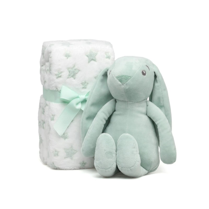 Este suave coelho de peluche verde, acompanhado de uma mantinha polar com estampado de estrelas, é o companheiro ideal para os primeiros meses do bebé.