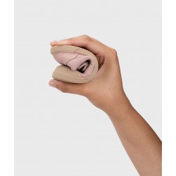 O fecho em tira garante um ajuste fácil e prático, incentivando a autonomia.