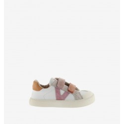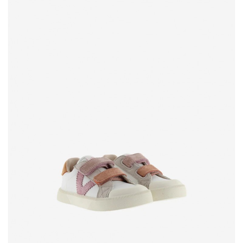 Sapatilhas desportivas barefoot para crianças fabricadas em efeito pele branca com peças multicolor de carmurça.