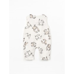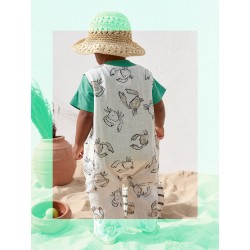 É um modelo sem mangas e com decote redondo, tem abertura frontal com botões de coco, abertura entre pernas com molas de metal sem níquel (abertura entre pernas até ao tamanho 18M) aplicação de bolsos laterais e o nosso estampado do sol.