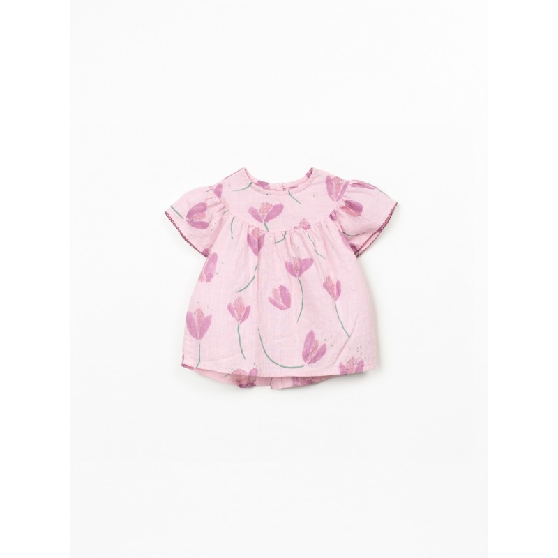 É um modelo com decote redondo, manga curta, abertura nas costas com botões de coco, a costa ligeiramente mais comprida e o nosso estampado de tulipas.