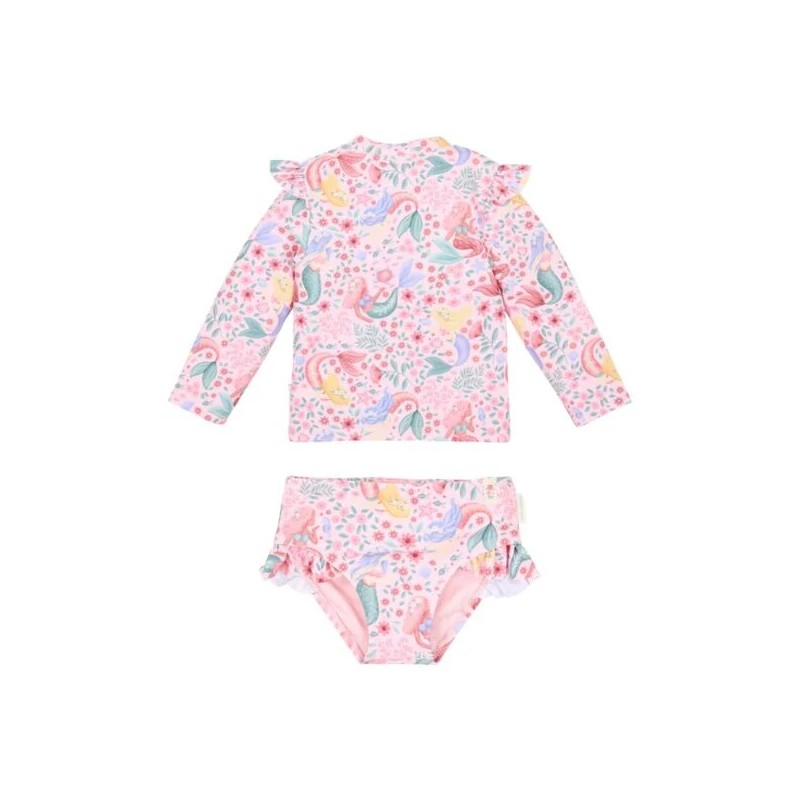 Para as pequenas sonhadoras que amam o mar e a fantasia, temos o conjunto de banho rosa Sereia dos Sonhos.
