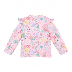 Os delicados babados nos ombros da camiseta e na calcinha de banho dão um toque feminino e divertido que combina perfeitamente com a estampa encantadora.