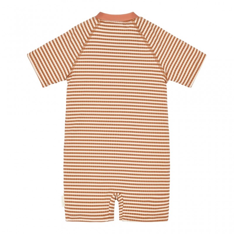 Este maiô marrom de mangas curtas com listras marrom-oceano foi feito para os pequenos aventureiros.
