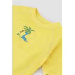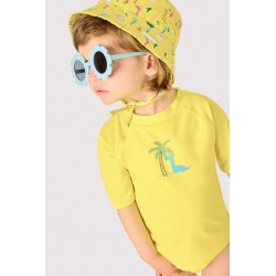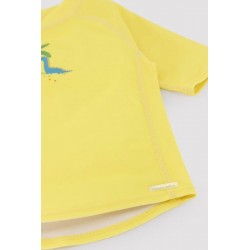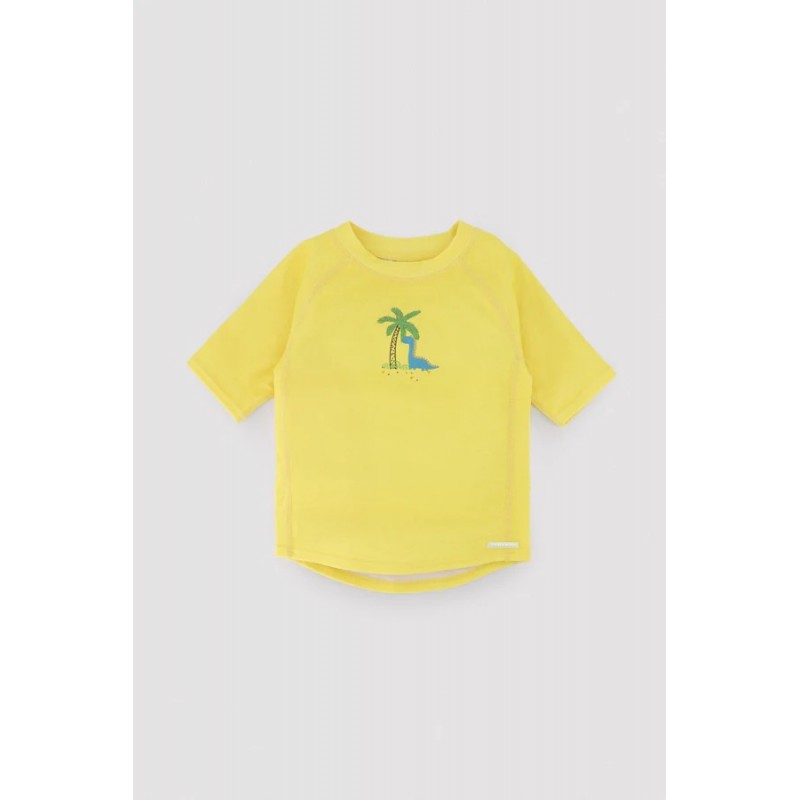 Blusa Manga Curta com Estampado de Dinossauro sob uma palmeira.