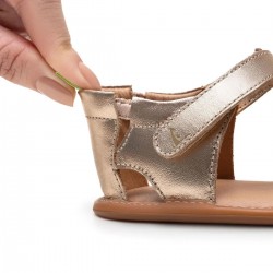 Fechamento superior ajustável por tira aderente para facilitar o calce e manter o pezinho firme.